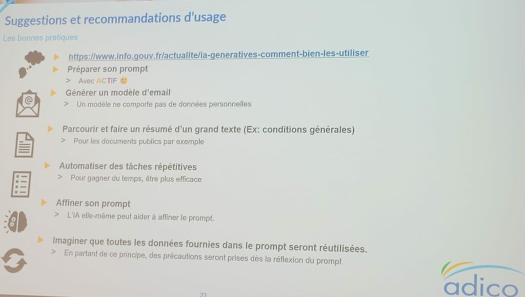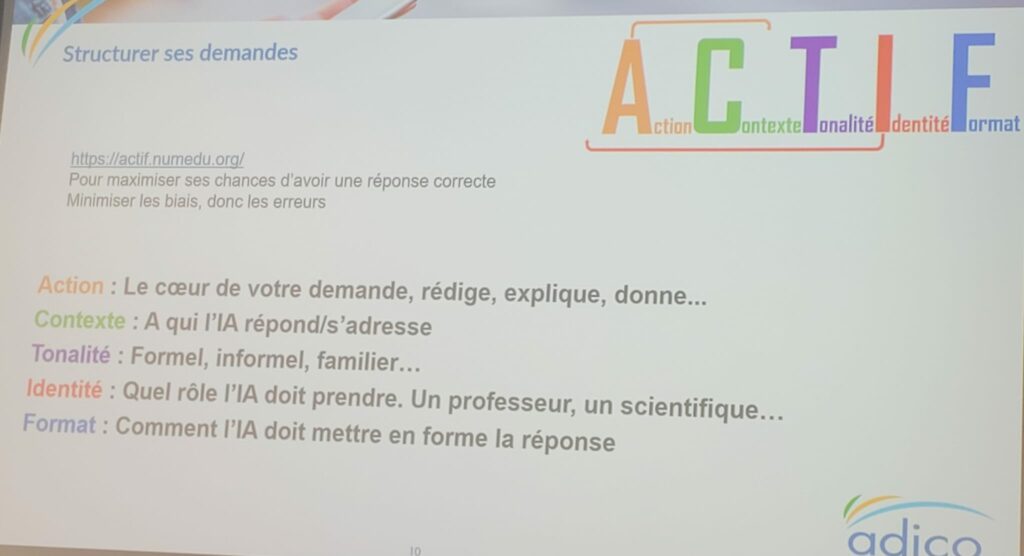 Tout d’abord, il faut être extrêmement prudent quant à l’exactitude et la véracité des productions générées. Si certaines erreurs sont sans conséquences, il faut savoir qu’une IA n’a pas pour finalité de nous dire la vérité. Elle pourra générer des images avec une main à six doigts, ce qui peut faire sourire, ou bien générer un texte donnant des statistiques invérifiables ou citant des textes de lois obsolètes, ce qui est plus gênant. Bien sûr certaines IA corrigent progressivement ce travers et certaines vous préciserons même leurs sources, mais le travail de vérification reste indispensable. Si les « hallucinations » (cas où l’IA invite purement et simplement) tendent à diminuer, les biais de confirmation (l’IA nous dit ce que voulons entendre pour nous plaire) ou d’auto-recensement (l’IA utilise des données qu’elle a elle-même générées et transformées) restent très nombreux. Par ailleurs, la qualité des réponses augmentera si on est « A.C.T.I.F. » en précisant donc l’Action voulue, le Contexte, la Tonalité, l’Identité, ainsi que le Format.