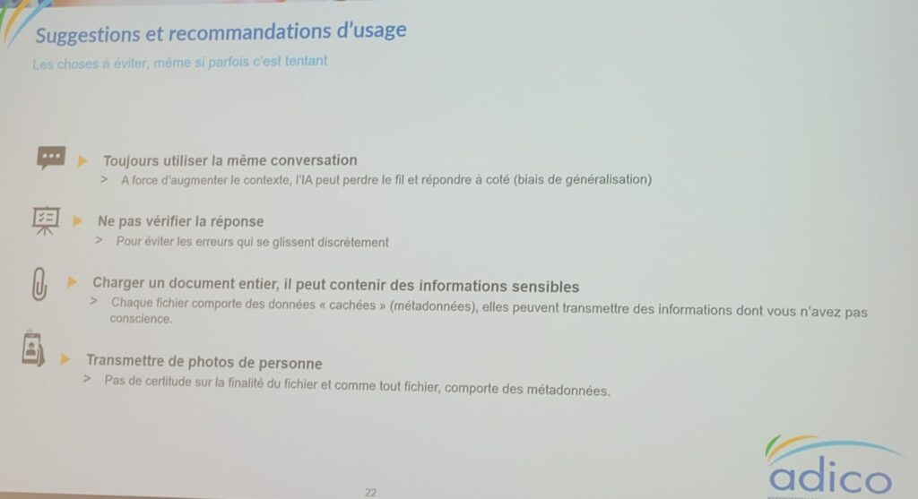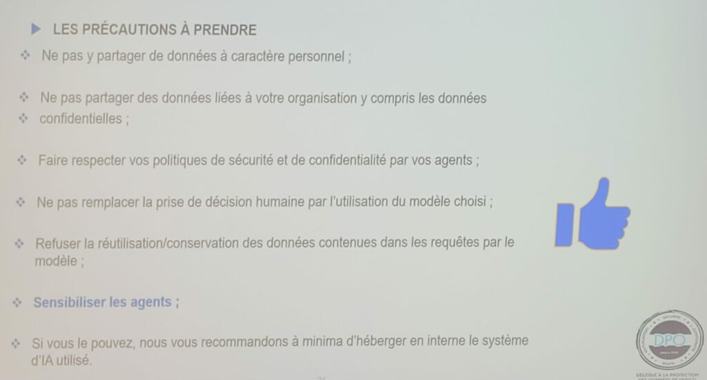 Ensuite, un accent particulièrement important a pu être mis sur le traitement et l’utilisation des données personnelles. Les IA absorbent et gardent en mémoire les données qui lui sont envoyées. Les particuliers, mais aussi les élus locaux et secrétaires de mairies qui peuvent avoir accès à des données de leurs administrés, doivent donc impérativement anonymiser les courriers, et retirer les données sensibles qu’ils peuvent contenir, avant de les envoyer vers une IA. Les data centers étant souvent à l’étranger, les données passent hors contrôle du RGPD mais la responsabilité des collectivités pourrait être engagée.